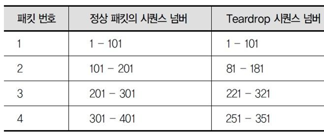 시스템을 파괴하는 데 가장 흔히 쓰인 초기의 DoS 공격이고 네트워크에서 패킷을 전송하기 적당한 크기로 잘라서
