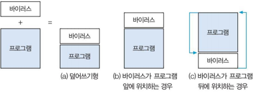 바이러스가 프로그램 뒷부분에 위치하는 것은 백신의 바이러스 탐지 및 차단 스캔으로부터 자신의 존재를 숨기기(은닉) 위해서이다.