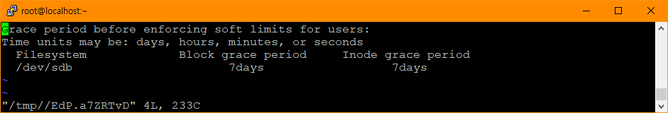 edquota는 사용자나 그룹에 쿼터를 설정할 때 사용하는 명령어이며 실행 시 편집기가 실행되된다.