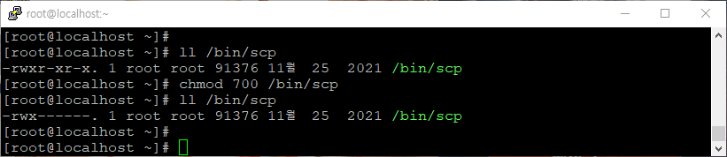 scp 명령어의 소유권을 700으로 바꿔서 root 사용자만 사용할 수 있게 설정한다.