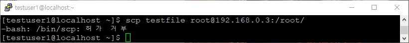 [testuser1@localhost ~]$ scp testfile root@192.168.0.3:/root/